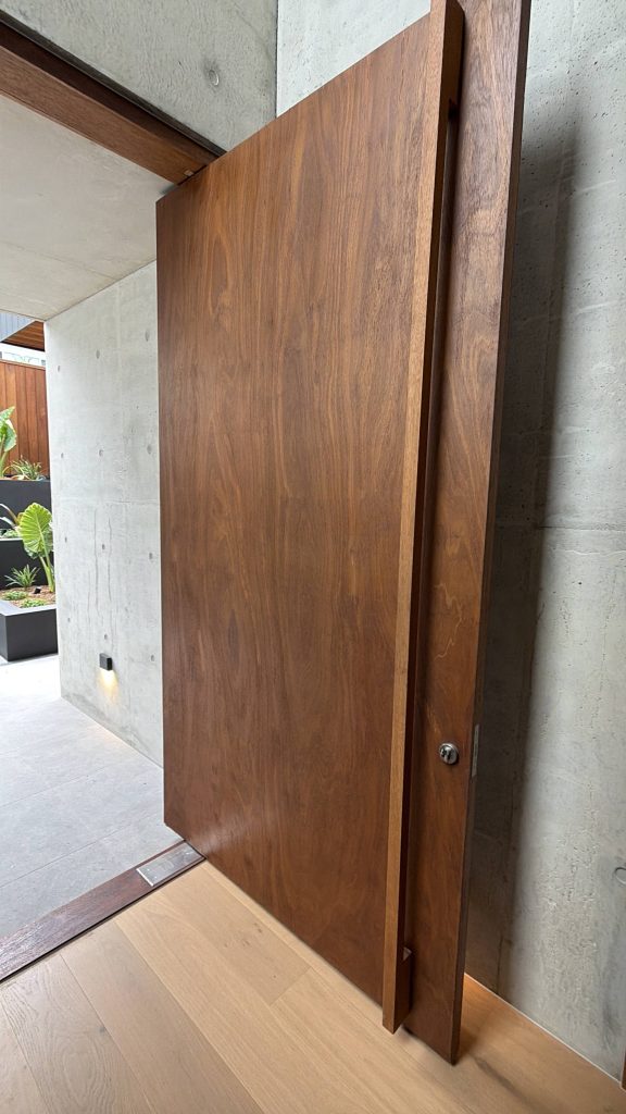 Weighty, seamless and dramatic. Our custom timber pivot doors are ideal for architectural entries — including oversized and full-height formats. Built for stability in Queensland’s climate and coastal conditions.