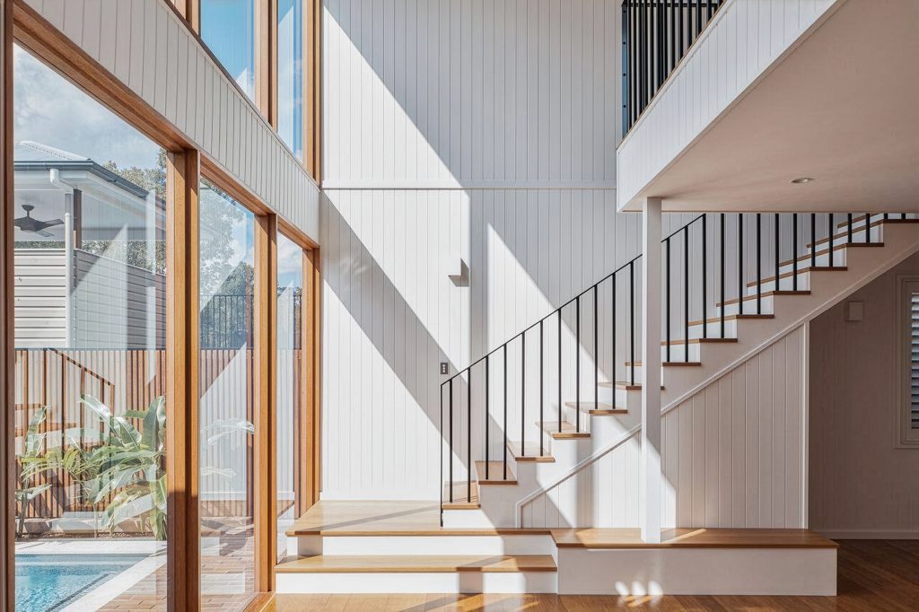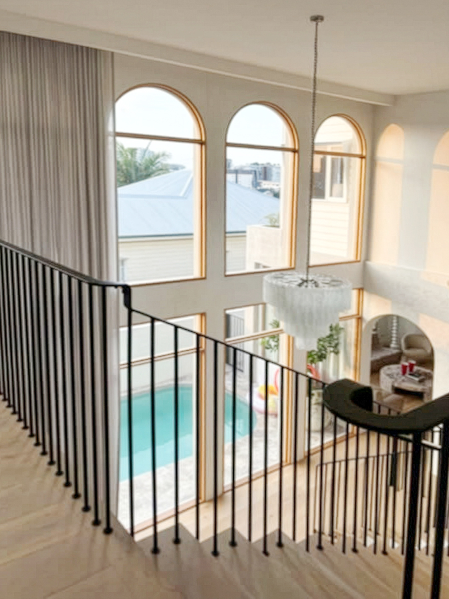 Fixed arched timber windows crafted by BTDW for this New Farm home — celebrating form, proportion, and natural light across two levels.